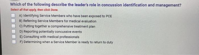 The publication coverss COSC. Which of the following describe the leaders role in concussion identification and management. Select all that apply then click Done.